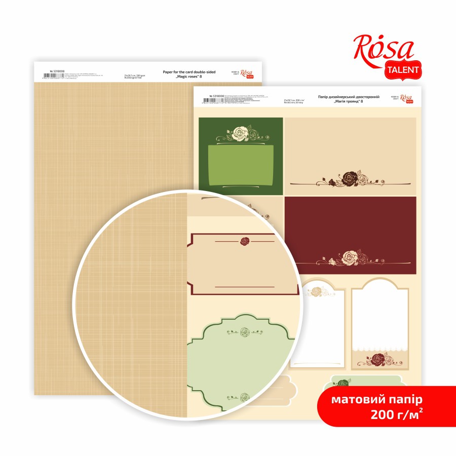 Ідеально матовий дизайнерський папір ROSA Talent підійде для робіт різного рівня складності. Завдяки своїм властивостям та трендовим мотивам папір легкий в роботі для новачків та відповідає очікуванням професіоналів скрапу та кардмейкінгу.