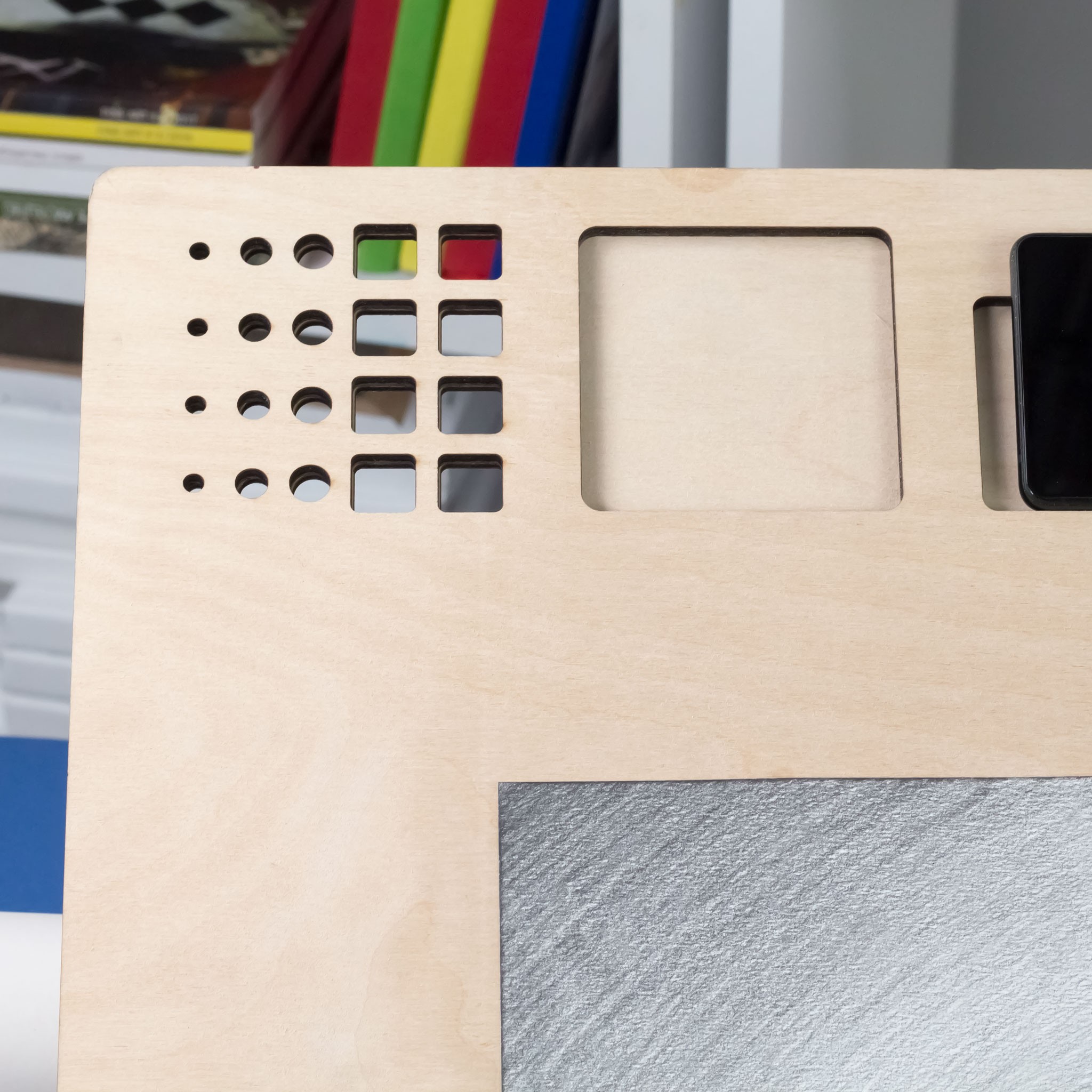 Стильний сучасний настільний мольберт-планшет виготовлений з фанери та оснащений отворами й пазами різної форми.