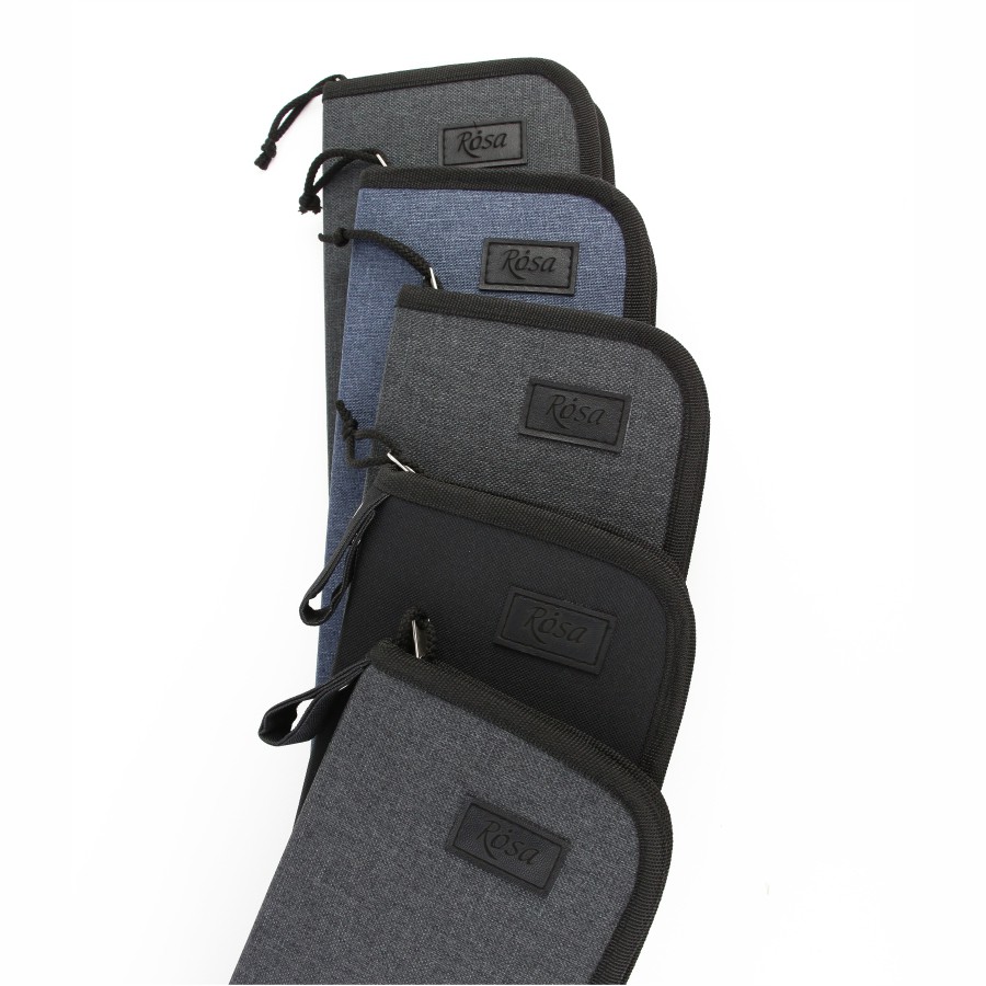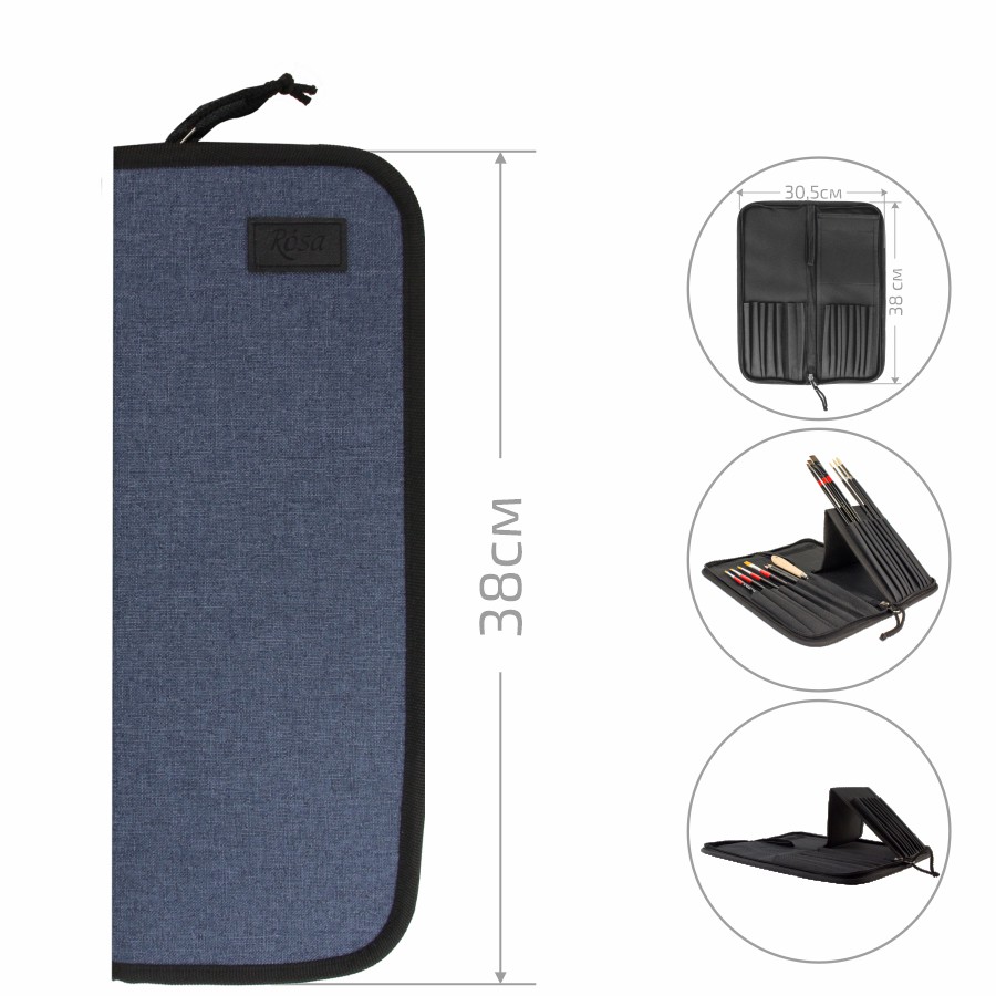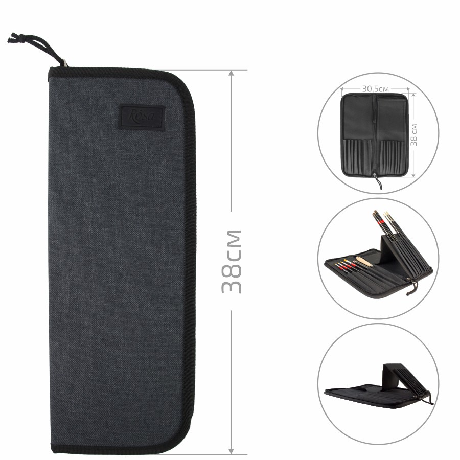 Пенали-холдери ROSA виготовлені із міцної синтетичної тканини, що забезпечує їх довговічність і практичність в процесі роботи. Пензлі та інші художні інструменти надійно фіксуються в середині пеналу, завдяки окремим коміркам. Цупка основа тримає форму пеналу при перенесені та зберігає пензлі.