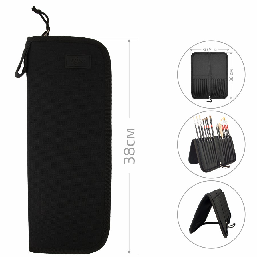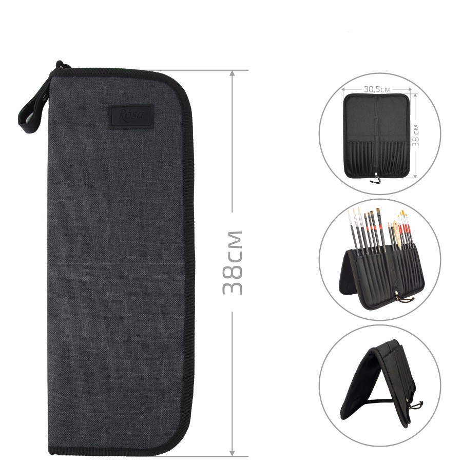 Пенали-холдери ROSA виготовлені із міцної синтетичної тканини, що забезпечує їх довговічність і практичність в процесі роботи. Пензлі та інші художні інструменти надійно фіксуються в середині пеналу, завдяки окремим коміркам. Цупка основа тримає форму пеналу при перенесені та зберігає пензлі.