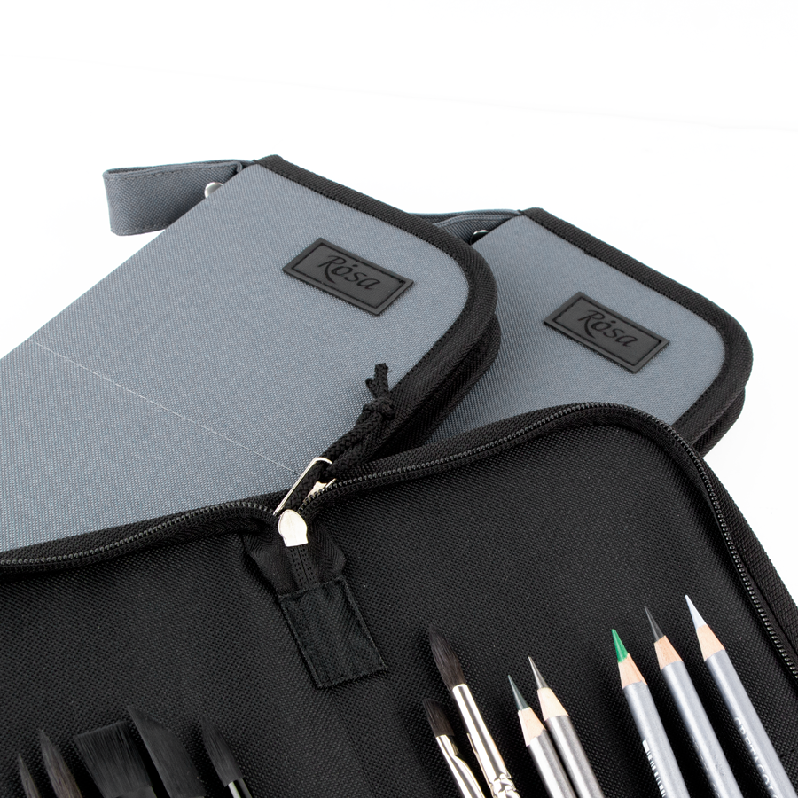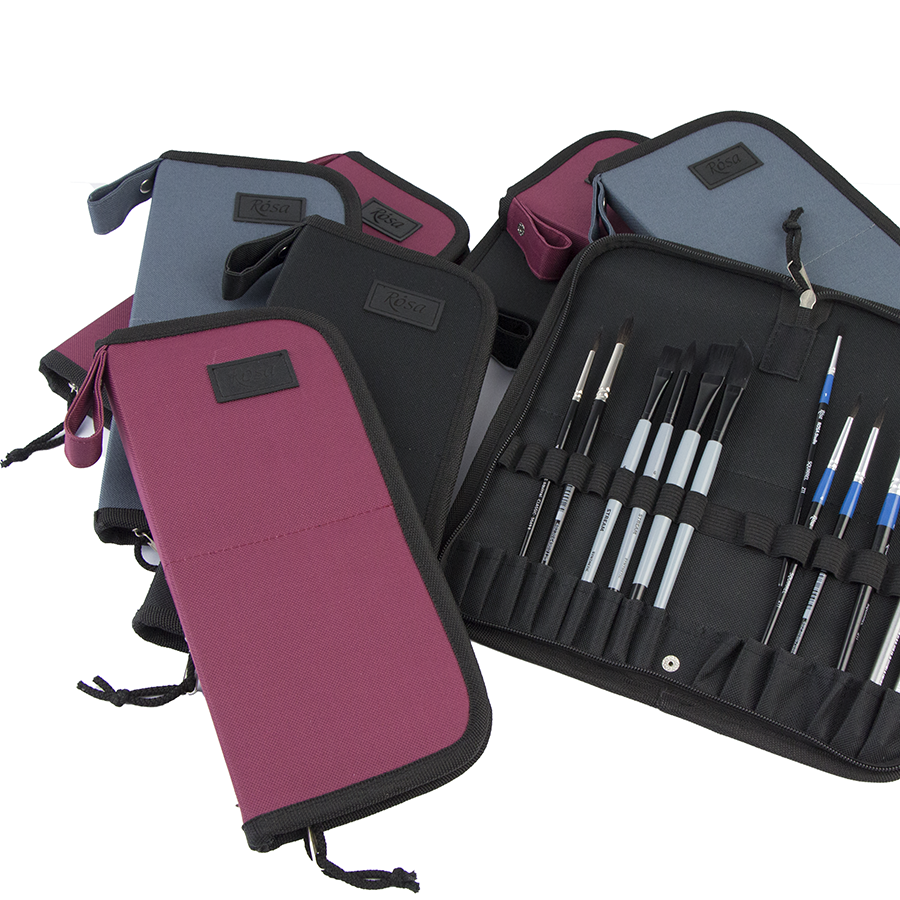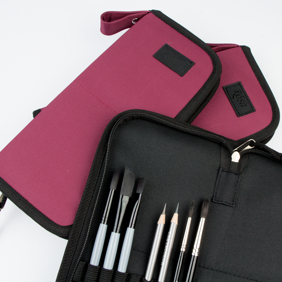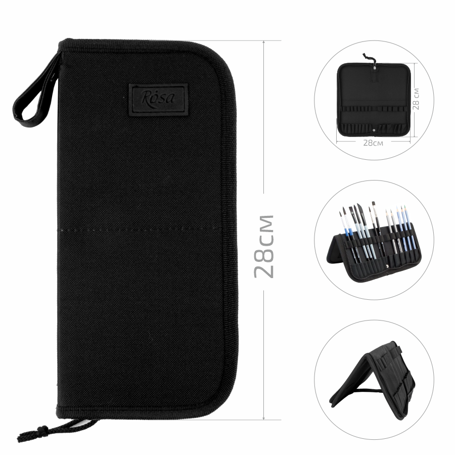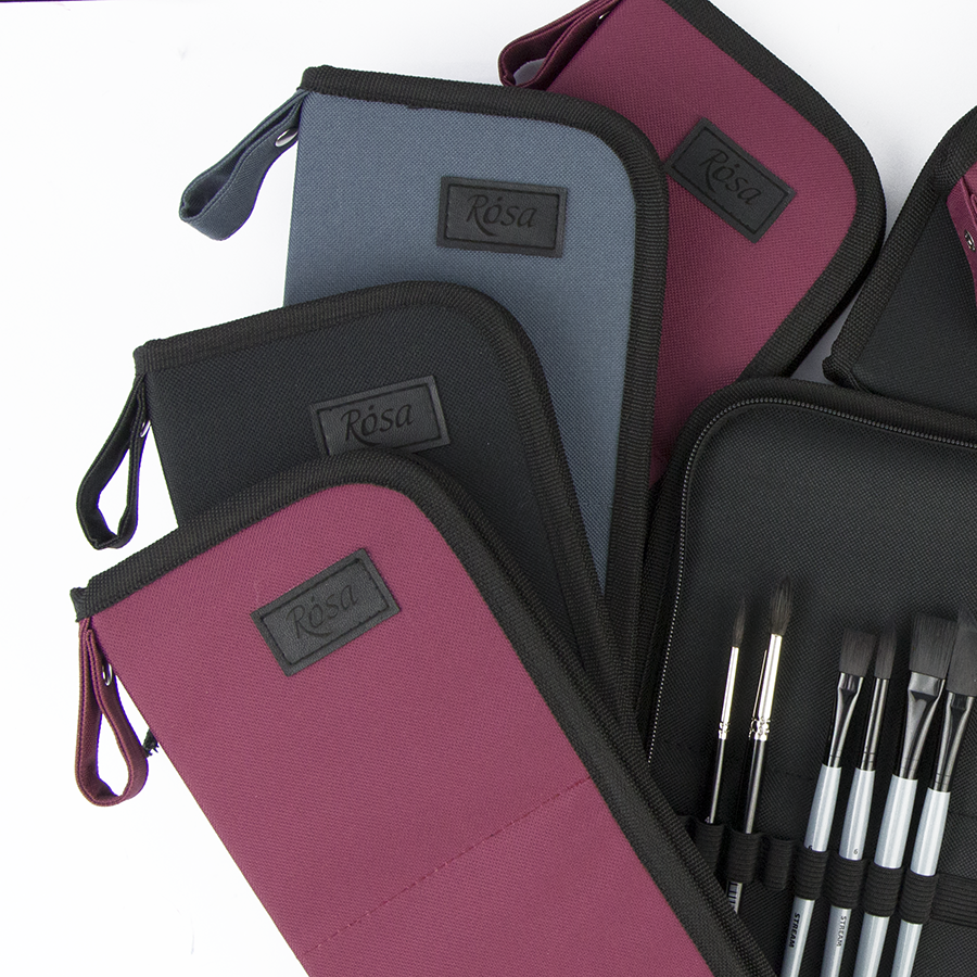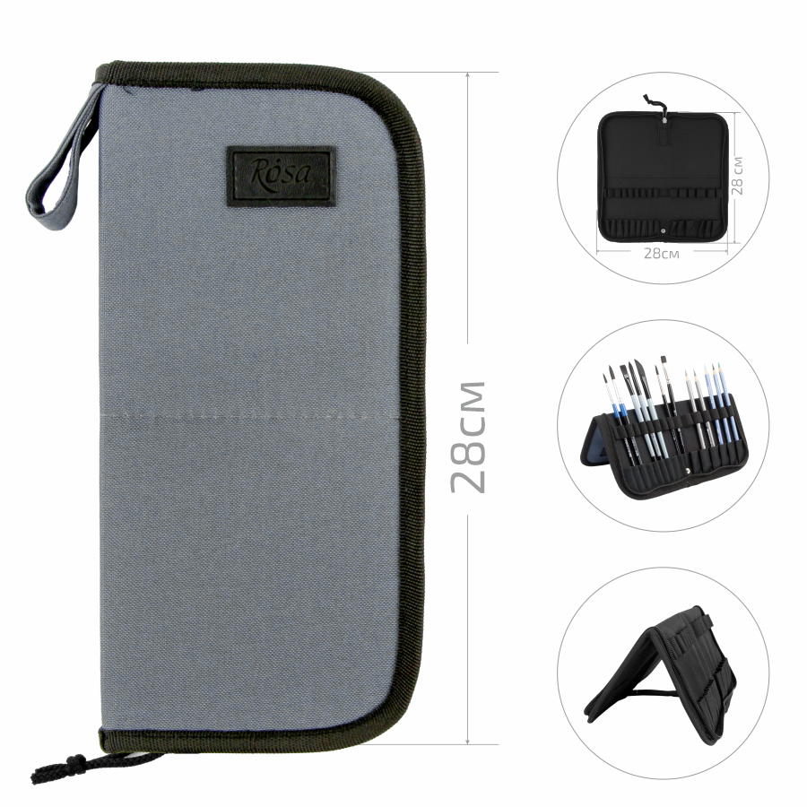 Пенали-холдери ROSA виготовлені із міцної синтетичної тканини, що забезпечує їх довговічність, практичність в процесі роботи та легкість в догляді. Пензлі та інші художні інструменти зручно фіксуються в середині пеналу, завдяки окремим коміркам. Цупка основа тримає форму пеналу при перенесені та зберігає пензлі.
