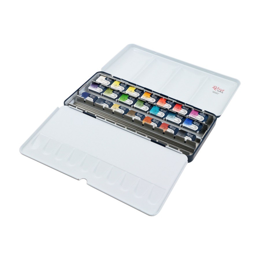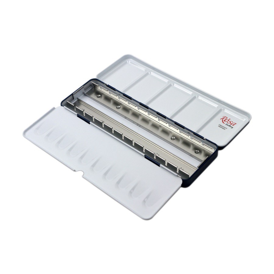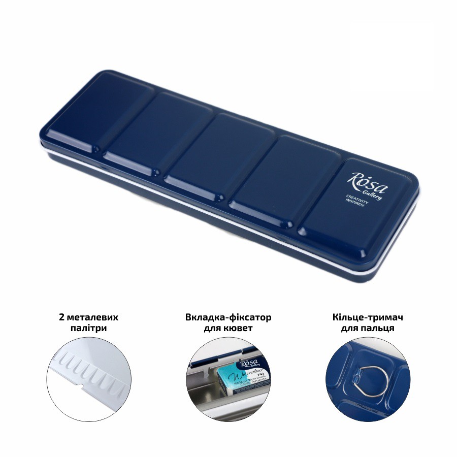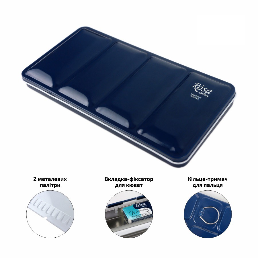 Металеві пенали для акварелі ROSA Gallery мають дві вбудовані палітри різної конфігурації, спеціальну вставку для кювет та зручний фіксатор для пальця на звороті пенала, що дозволяє легко утримувати фарби в руці під час роботи.