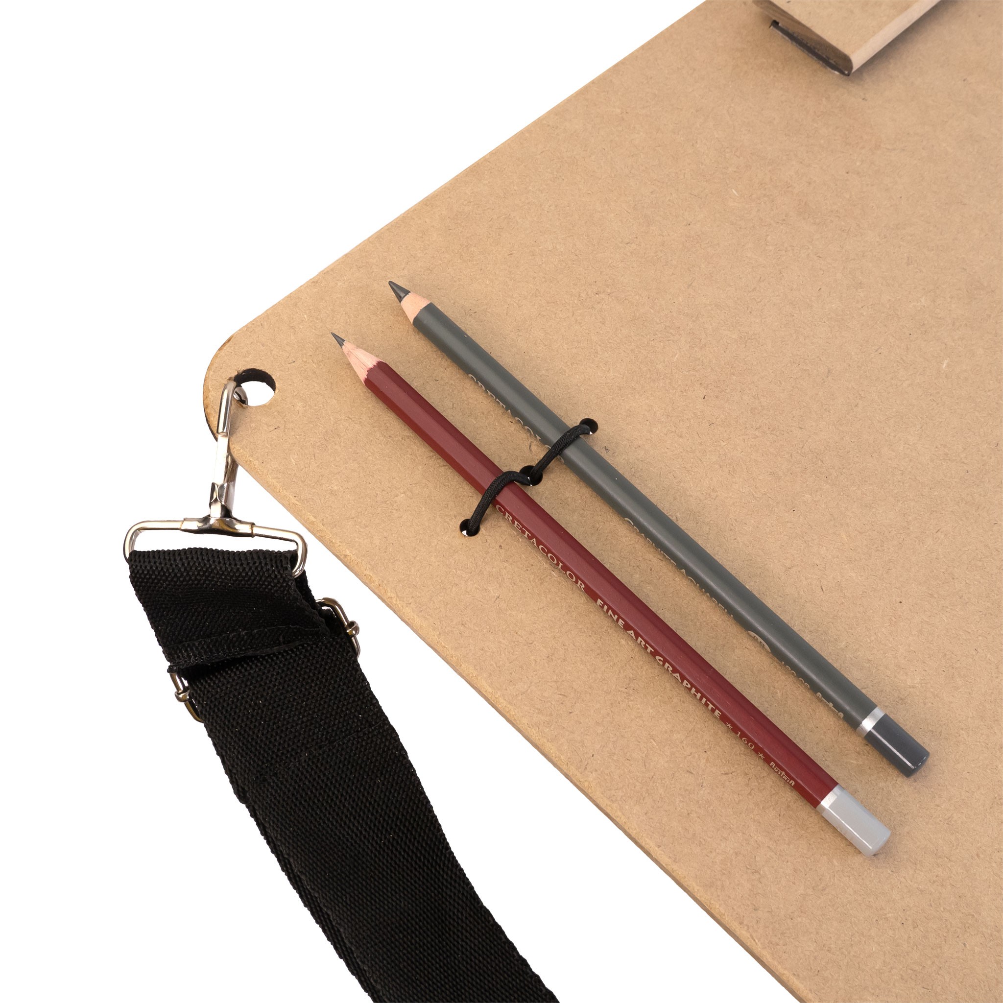 Спосіб кріплення паперу дозволяє використовувати та комфортно розташувати різні його формати на одному розмірі планшета. Планшети з МДФ доповнені ременем на плече, який дозволяє з комфортом використовувати його на пленері.