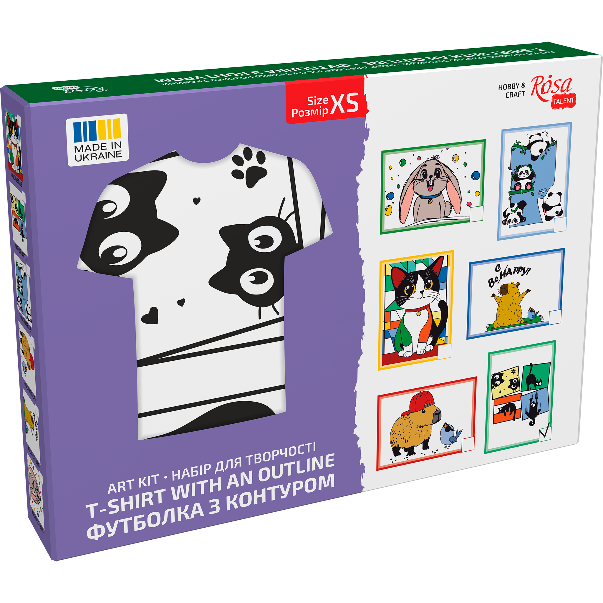 Кожен набір містить певну кількість кольорів спеціальних акрилових фарб для тканини згідно з мотивом набору та футболку-розмальовку ROSA Talent білого кольору виготовлені зі 100% бавовняної тканини. При правильному закріплені та догляді, розписана річ може слугувати роками. Процес розпису захопливий та легкий навіть для дитини, адже контури малюнку вже нанесені на основу.