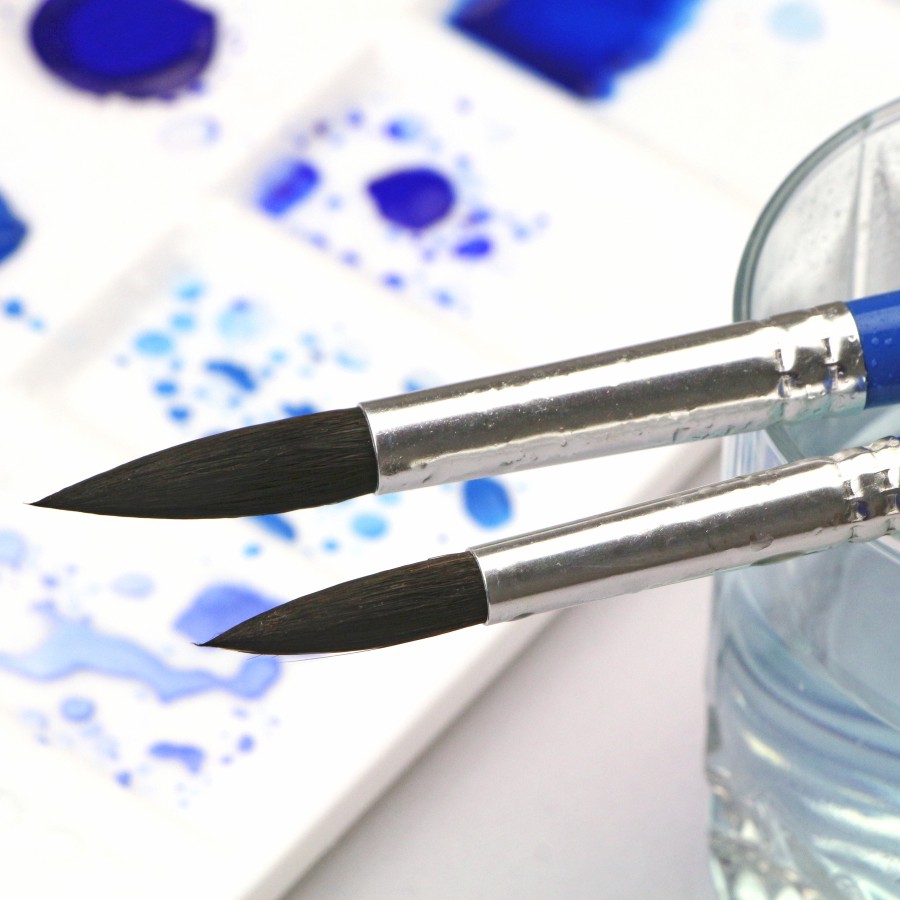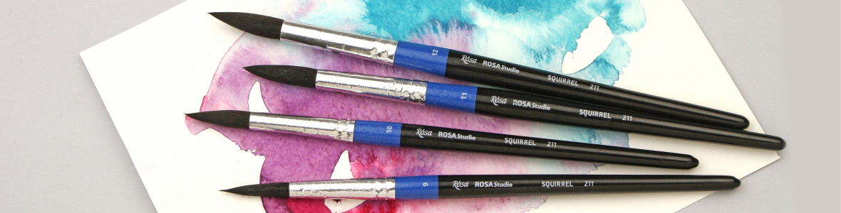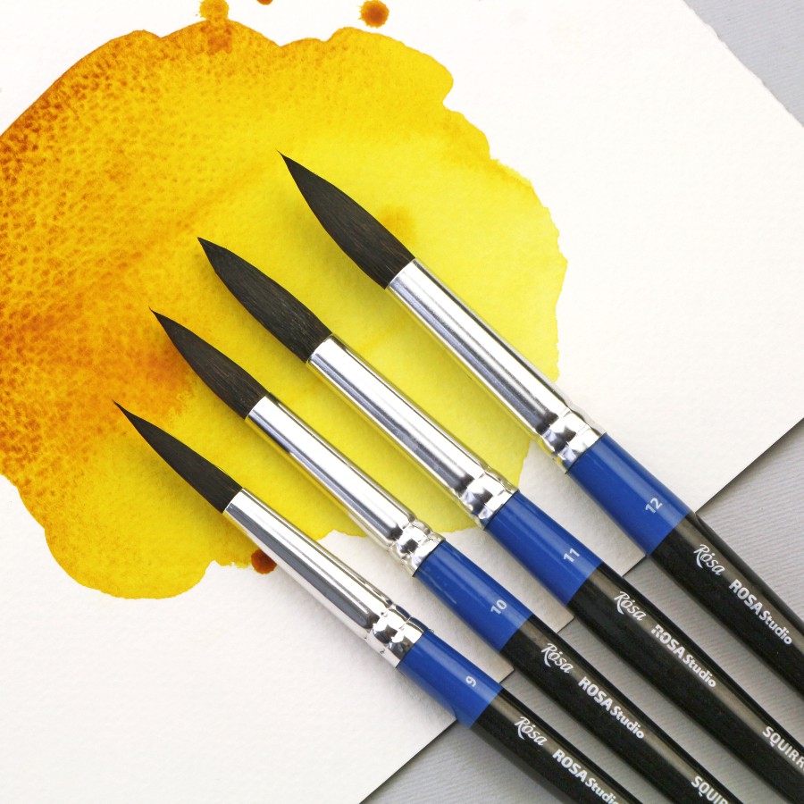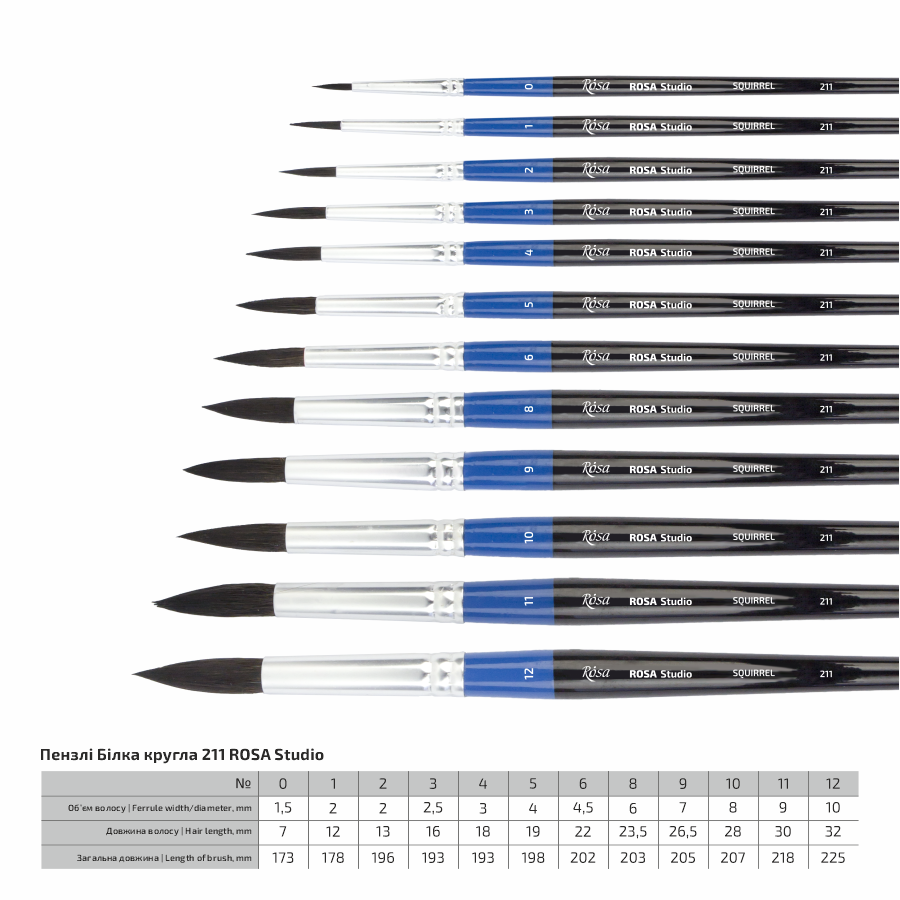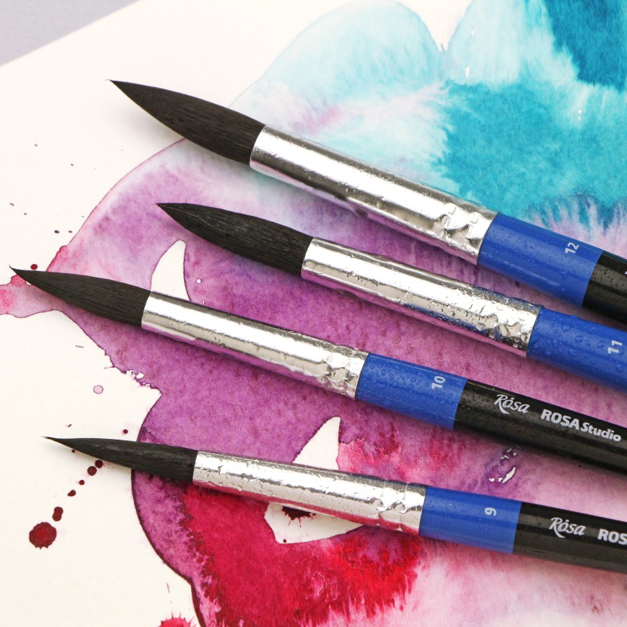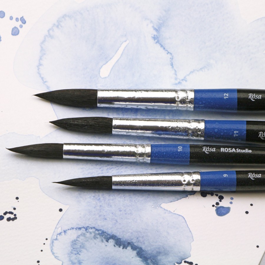 Пензлі круглі ROSA Studio з волосу білки в розмірах від 0 до 12 мають стандартну виставку робочої частини. Волос білки м’який, тонкий і еластичний, завдяки чому досягається бездоганний контроль над текучістю фарби і здатністю утворювати гострий кінчик.