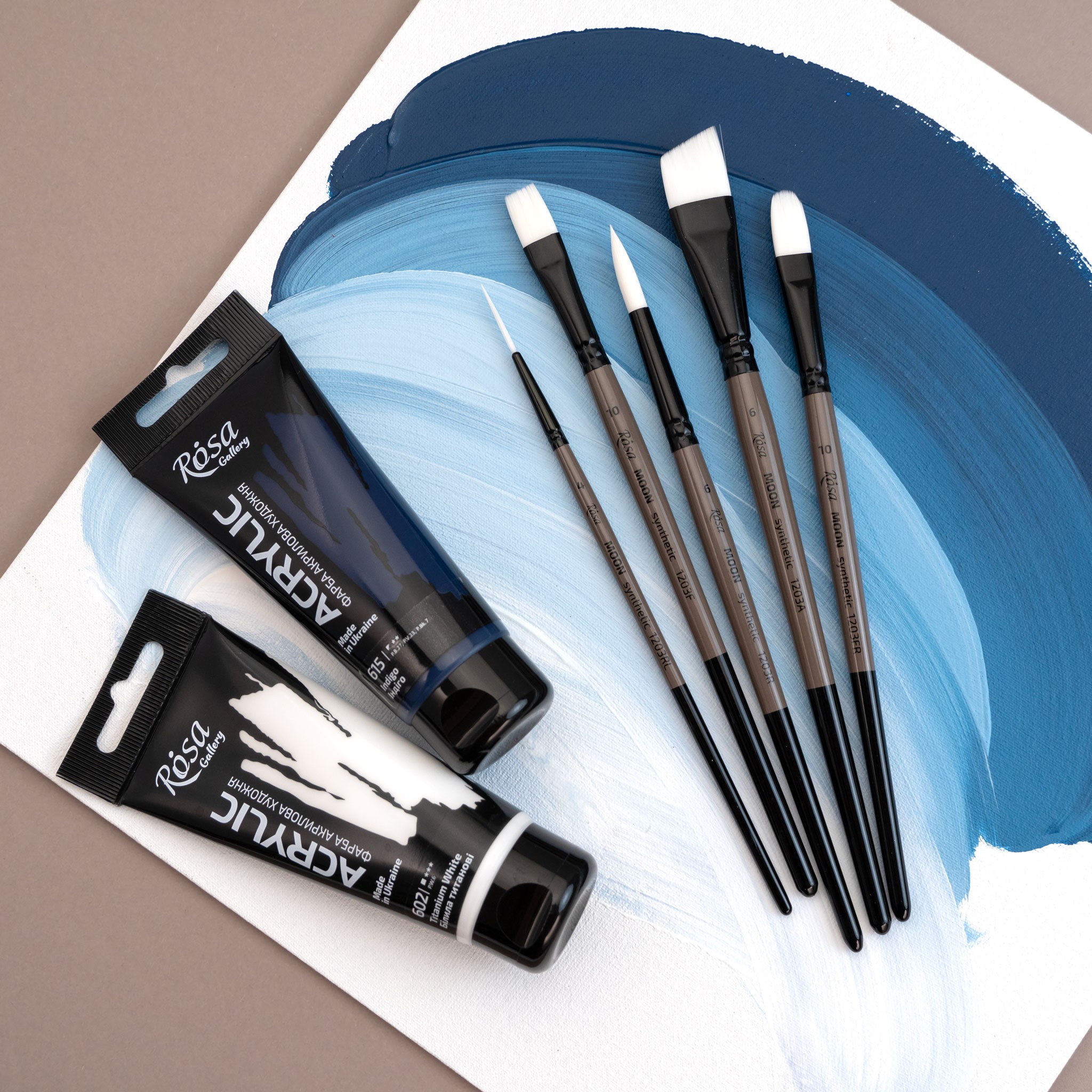 Серія MOON – пензлі з еластичного м’якого синтетичного білого волосу на короткій ручці. М’який, при цьому еластичний та контрольований волосяний пучок добре тримає початкову форму в сухому стані та зберігає її у вологому. Кругла та кутова форми формують гострий кінчик, що зручно для створення тонких ліній, прописання дрібних деталей та фрагментів.