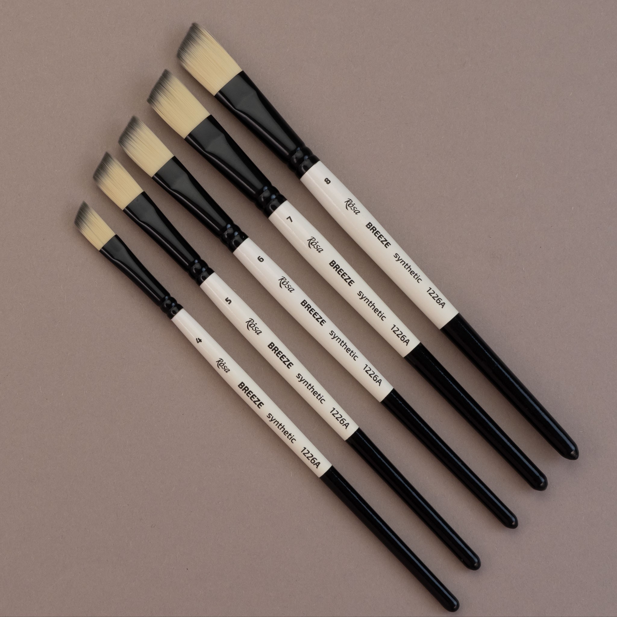 Серія BREEZE – пензлі з тонкого м’якого синтетичного волосу, що ідеально підійдуть для роботи як з акриловими фарбами, а також можуть використовуватись для акварелі. М’який, при цьому пружний світло бежевий ворс з темно-сірим кінчиком, добре тримає форму до та після змочування, легко керується в роботі. Дозволяє прописувати деталі та дуже тонкі лінії.