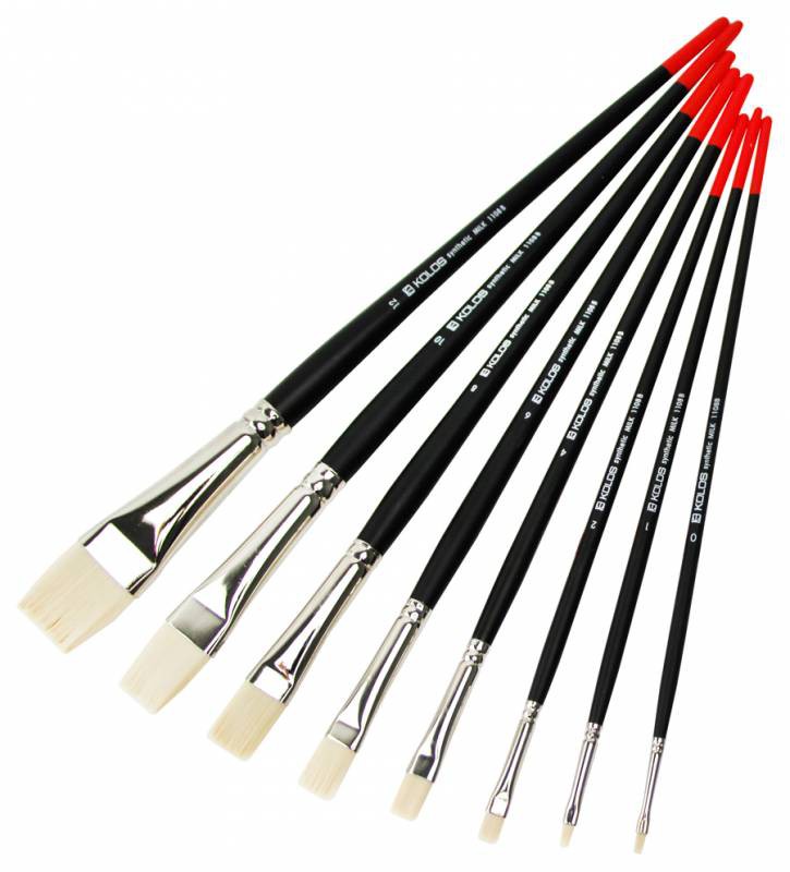 Пензлі плоскі з білого волоса синтетики серії Milk KOLOS мають стандартну виставку робочої частини. Синтетичні пензлі серії Milk зроблені з еластично-пружного волоса, який відмінно імітує щетину, але при цьому пензлі служать в рази довше за натуральний волос.