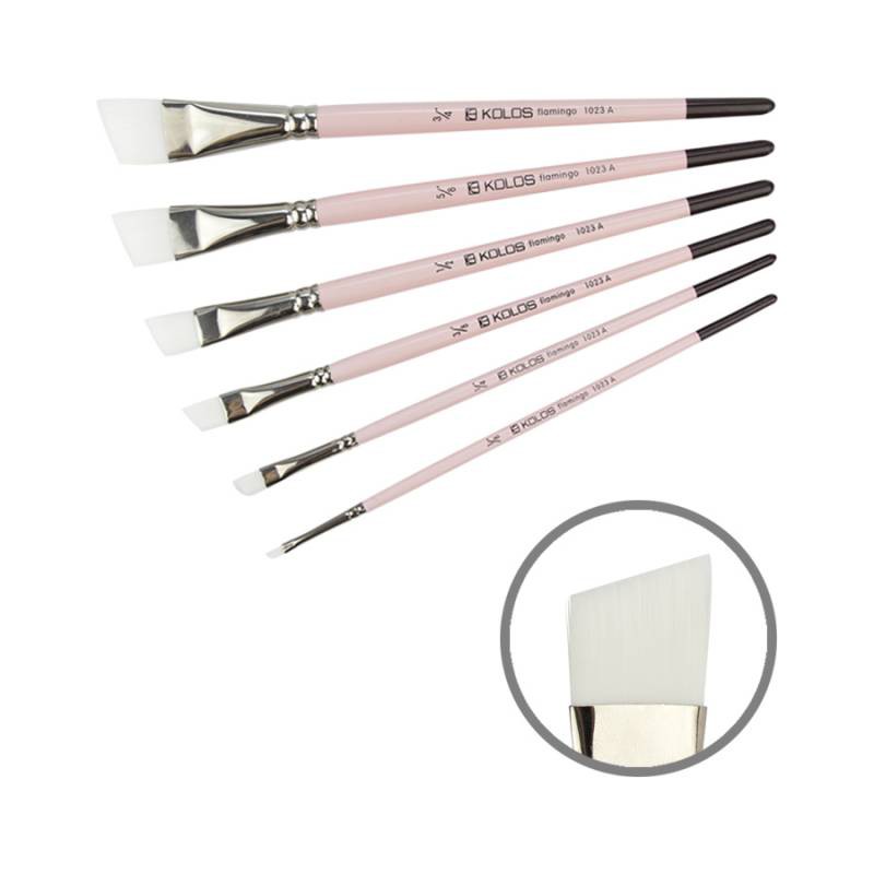 Пензлі кутові з волоса синтетики серії Flamingo KOLOS мають стандартну виставку робочої частини. Підрізані під кутом плоскі пензлі з коротким волосом. Кінчик пензля дозволяє швидко і впевнено змінювати об’єм волоса, який тримає фарбу. Це неперевершений інструмент для створення переходу одного кольору в інший в важкодоступних, вузьких, дрібних частинах картини.