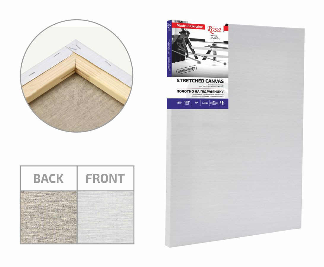 Полотно на підрамнику ROSA виготовляється з полотен заґрунтованих олійно-емульсійним білим ґрунтом або акриловим в двох кольорах – класичний білий чи чорний. Перед ґрунтуванням, полотно ретельно проклеюється міцною та еластичною проклейкою в три шари, щоб запобігти проходженню фарби на зворотну сторону.