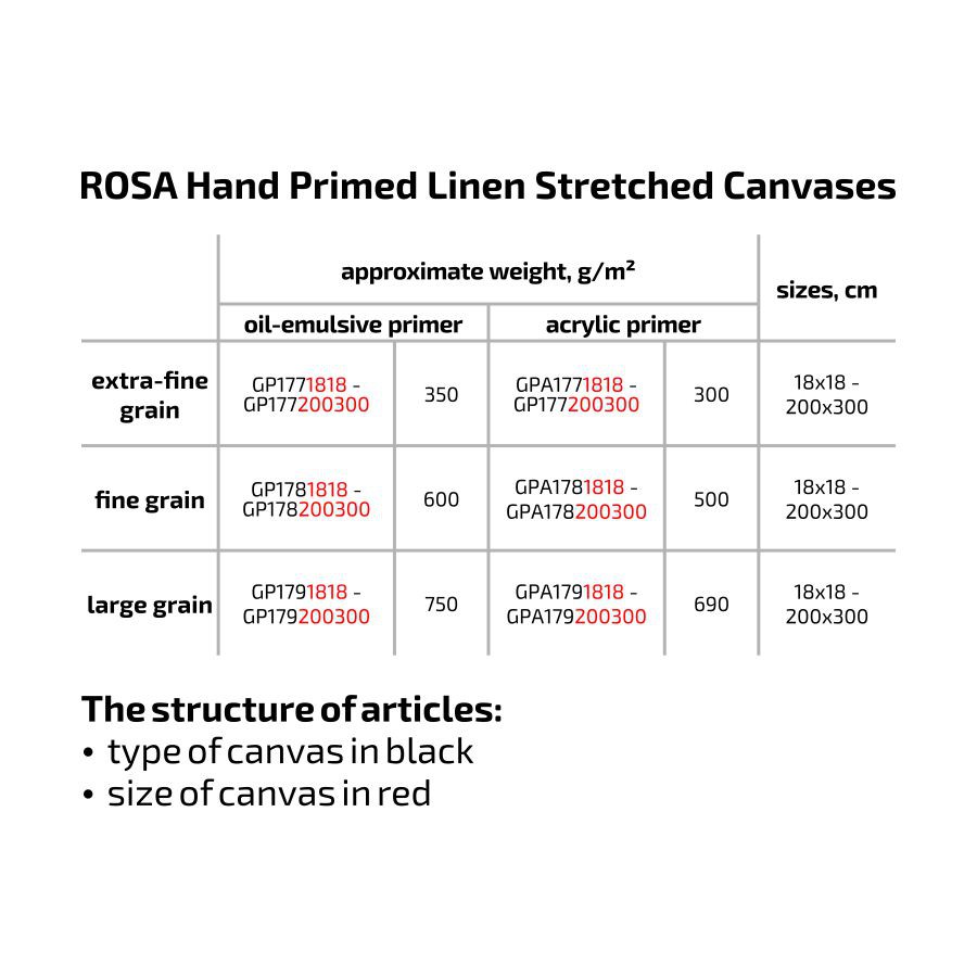 В асортименті ROSA представлені три види зернистості лляного полотна щільністю від 300 до 690г/м2, що дозволяє художнику підібрати основу згідно жанру майбутньої картини. Вага ґрунтованого полотна може коливатись в межах ±20%